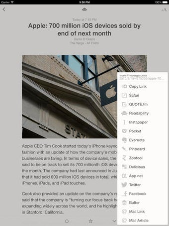Dit is niet het enige waar je als gebruiker invloed op hebt. Er zijn ook veel sociale functies voor het delen van content. Er zijn veel geïntegreerde diensten in Reeder 2, die je naar wens kunt gebruiken, verbergen of een gebaar aan kunt toewijzen.